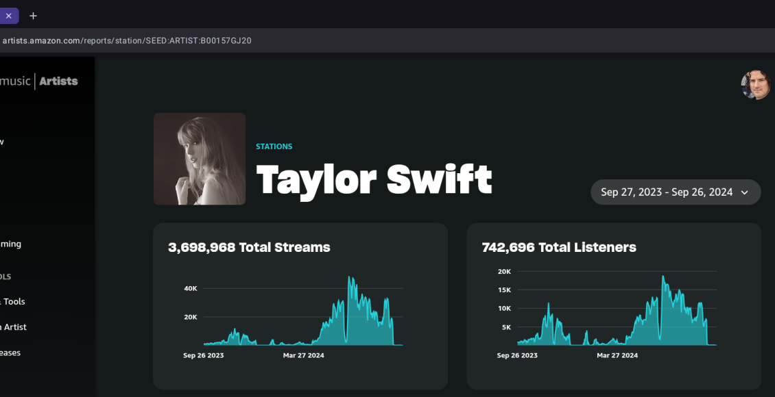 We examine the Amazon Music for Artists Application which has real-time data for an artists: Streams, listners, fans, Alexa Voice Request, Stations Plays by Stations and visual graphs. We analyze a full year from September 2023 until September 2024 to show the visual, and inexplicable dropoff from hundreads of thousands of streams, listeners and station plays to essentially nothing overnight.We further examine this at length looking specifically at Marc Mysterio’s streaming and listener activity on the Amazon Music Taylor Swift Station and Amazon Music Marc Mysterio Station.